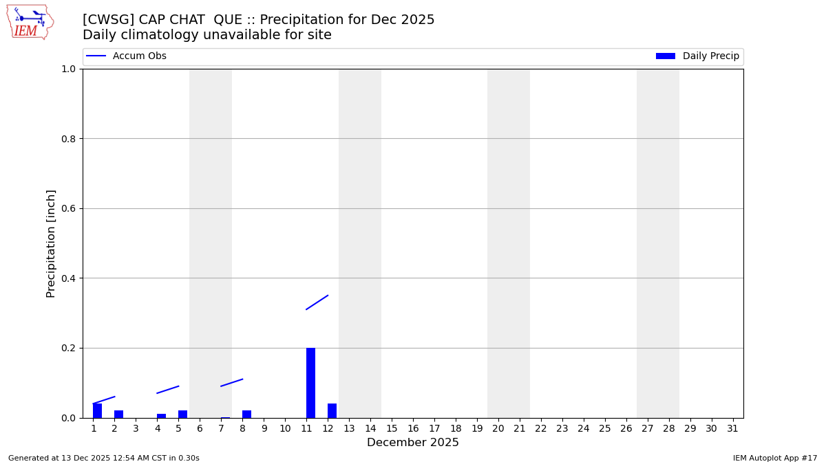 Description: This chart is of daily precipitation for the month. The red line would be an average month while the blue line and bars are observations.