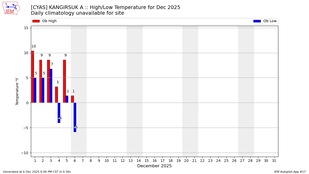 Description: This chart of the monthly temperature data. The bars are the observations and the dots are climatology.