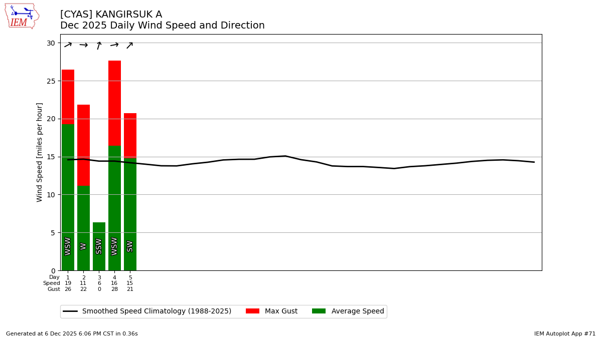 | 30 | 01 High: 10.4 Low: 5 Precip: M Avg Wind: WSW @ 19.3 Gust: SW @ 26 (12:00 PM) RH% Min/Max: 78-85 Feel Min/Max: -16 to -7 | 02 High: 8.6 Low: 5 Precip: M Avg Wind: W @ 11.2 Gust: W @ 22 (1:00 PM) RH% Min/Max: 85-92 Feel Min/Max: -11 to -6 | 03 High: 8.6 Low: 6.8 Precip: M Avg Wind: SSW @ 6.3 RH% Min/Max: 78-92 Feel Min/Max: -6 to 2 | 04 High: 3.2 Low: -4 Precip: M Avg Wind: WSW @ 16.4 Gust: W @ 28 (1:00 PM) RH% Min/Max: 84-92 Feel Min/Max: -27 to -15 | 05 High: 8.6 Low: 1.4 Precip: M Avg Wind: SW @ 14.8 Gust: W @ 21 (12:20 AM) RH% Min/Max: 78-92 Feel Min/Max: -15 to -6 | 06 High: 1.4 Low: -5.8 Precip: M RH% Min/Max: 77-92 Feel Min/Max: -17 to -2 |