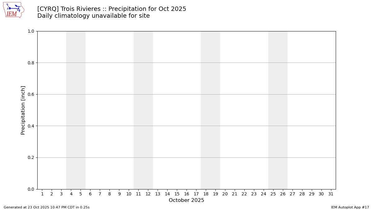 Description: This chart is of daily precipitation for the month. The red line would be an average month while the blue line and bars are observations.