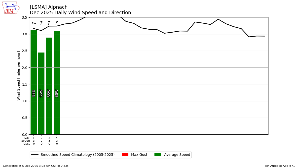 | 30 | 01 High: 42.8 Low: 30.2 Precip: M Avg Wind: ESE @ 3.1 RH% Min/Max: 75-100 Feel Min/Max: 25 to 43 | 02 High: 37.4 Low: 28.4 Precip: M Avg Wind: SSW @ 2.4 RH% Min/Max: 87-100 Feel Min/Max: 27 to 37 | 03 High: 37.4 Low: 28.4 Precip: M Avg Wind: SSW @ 2.9 RH% Min/Max: 87-100 Feel Min/Max: 25 to 37 | 04 High: 35.6 Low: 32 Precip: M Avg Wind: SSW @ 3.1 RH% Min/Max: 87-100 Feel Min/Max: 26 to 36 | 05 High: 37.4 Low: 35.6 Precip: M RH% Min/Max: 93-100 Feel Min/Max: 36 to 37 | 06 Precip: M |