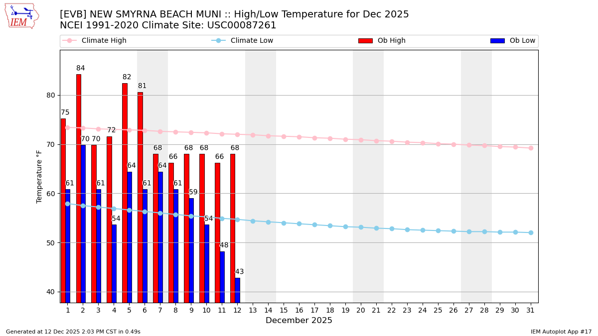 Description: This chart of the monthly temperature data. The bars are the observations and the dots are climatology.
