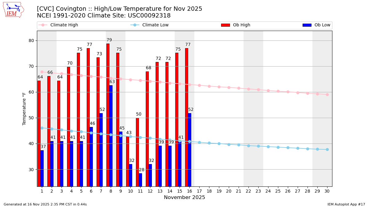 Description: This chart of the monthly temperature data. The bars are the observations and the dots are climatology.