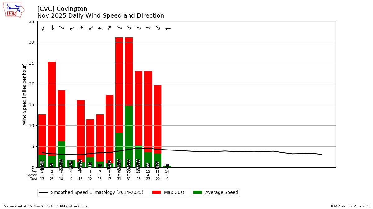| 09 High: 75.2 Low: 44.6 Precip: 0.06 Avg Wind: WNW @ 8.3 Gust: W @ 31 (8:55 PM) RH% Min/Max: 35-100 Feel Min/Max: 37 to 75 | 10 High: 42.8 Low: 32 Precip: M Avg Wind: WNW @ 14.7 Gust: WNW @ 31 (3:35 PM) RH% Min/Max: 36-70 Feel Min/Max: 22 to 36 | 11 High: 50 Low: 28.4 Precip: M Avg Wind: WNW @ 5.2 Gust: N @ 23 (10:15 AM) RH% Min/Max: 27-75 Feel Min/Max: 22 to 50 | 12 High: 68 Low: 32 Precip: M Avg Wind: W @ 3.6 Gust: W @ 23 (11:15 AM) RH% Min/Max: 40-93 Feel Min/Max: 32 to 68 | 13 High: 71.6 Low: 39.2 Precip: M Avg Wind: NW @ 3.3 Gust: WNW @ 20 (1:15 PM) RH% Min/Max: 27-100 Feel Min/Max: 39 to 72 | 14 High: 71.6 Low: 39.2 Precip: M Avg Wind: E @ 0.3 RH% Min/Max: 20-100 Feel Min/Max: 39 to 72 | 15 High: 75.2 Low: 41 Precip: M Gust: SW @ 15 (11:35 AM) RH% Min/Max: 44-93 Feel Min/Max: 41 to 75 |
