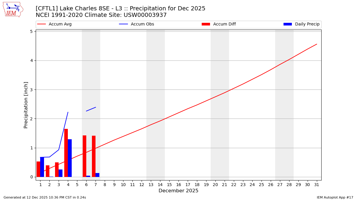Description: This chart is of daily precipitation for the month. The red line would be an average month while the blue line and bars are observations.