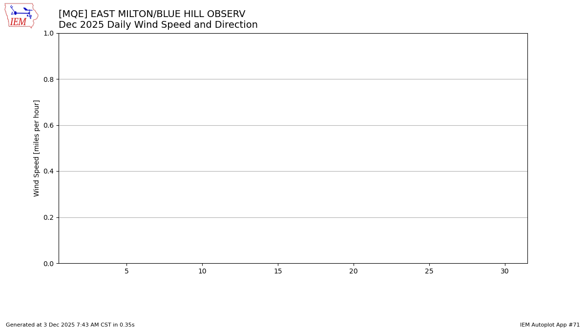 The calendar chart below shows the daily reported climate variables. You can click on a date to display the values for all sites for that day. Time stamps are displayed in the America/New_York timezone. Wind speeds are in mph and temperatures in Fahrenheit. Values flagged with a (E) are estimated by the IEM.