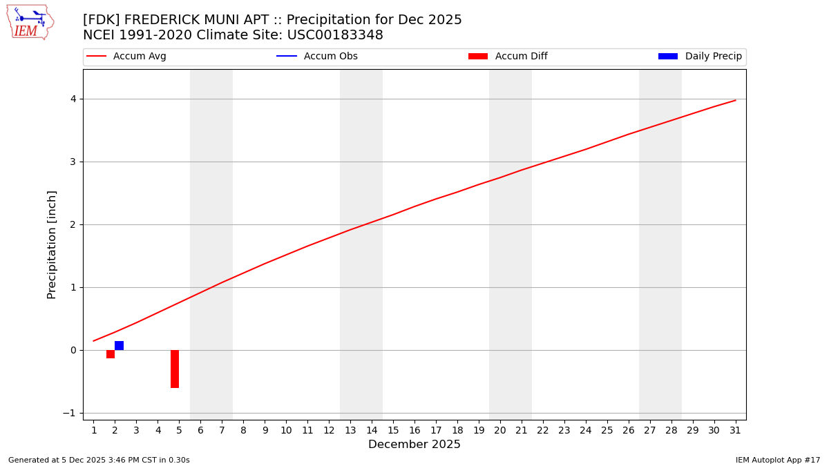Description: This chart is of daily precipitation for the month. The red line would be an average month while the blue line and bars are observations.