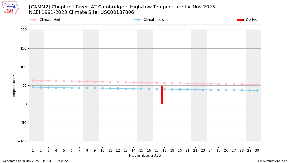 Description: This chart of the monthly temperature data. The bars are the observations and the dots are climatology.