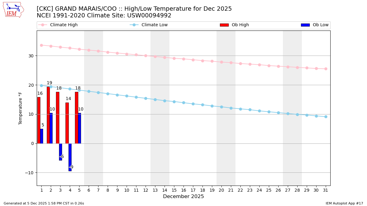 Description: This chart of the monthly temperature data. The bars are the observations and the dots are climatology.