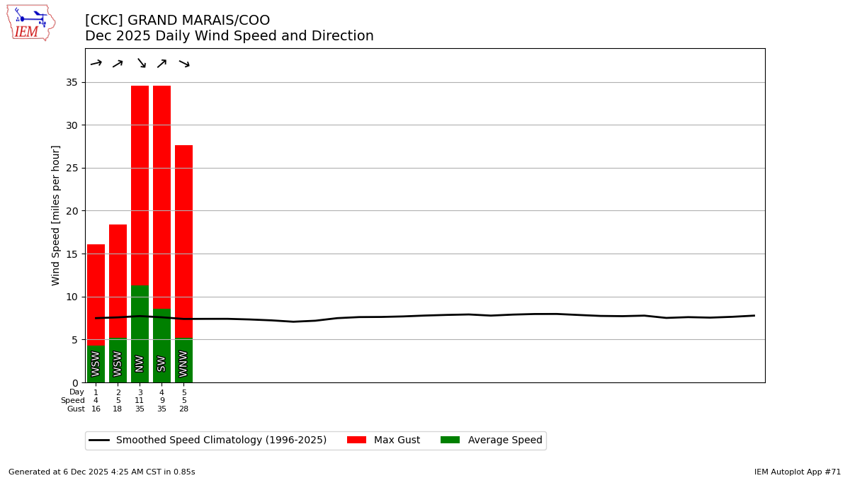 | 30 | 01 High: 15.8 Low: 5 Precip: M Avg Wind: WSW @ 4.3 Gust: WSW @ 16 (2:55 PM) RH% Min/Max: 57-92 Feel Min/Max: -4 to 10 | 02 High: 19.4 Low: 10.4 Precip: M Avg Wind: WSW @ 5.2 Gust: SW @ 18 (2:55 PM) RH% Min/Max: 79-100 Feel Min/Max: 2 to 18 | 03 High: 17.6 Low: -5.8 Precip: M Avg Wind: NW @ 11.3 Gust: WNW @ 35 (10:15 AM) RH% Min/Max: 47-92 Feel Min/Max: -20 to 6 | 04 High: 14 Low: -9.4 Precip: M Avg Wind: SW @ 8.6 Gust: WSW @ 35 (4:55 PM) RH% Min/Max: 33-92 Feel Min/Max: -23 to 4 | 05 High: 12.2 Low: 10.4 Precip: M RH% Min/Max: 85-100 Feel Min/Max: 1 to 12 | 06 Precip: M |