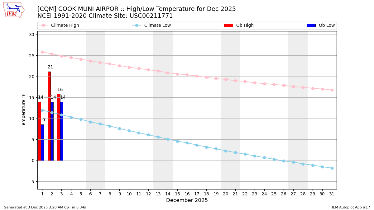 Description: This chart of the monthly temperature data. The bars are the observations and the dots are climatology.