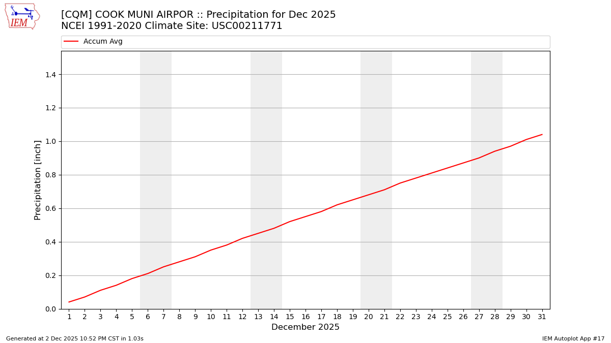 Description: This chart is of daily precipitation for the month. The red line would be an average month while the blue line and bars are observations.