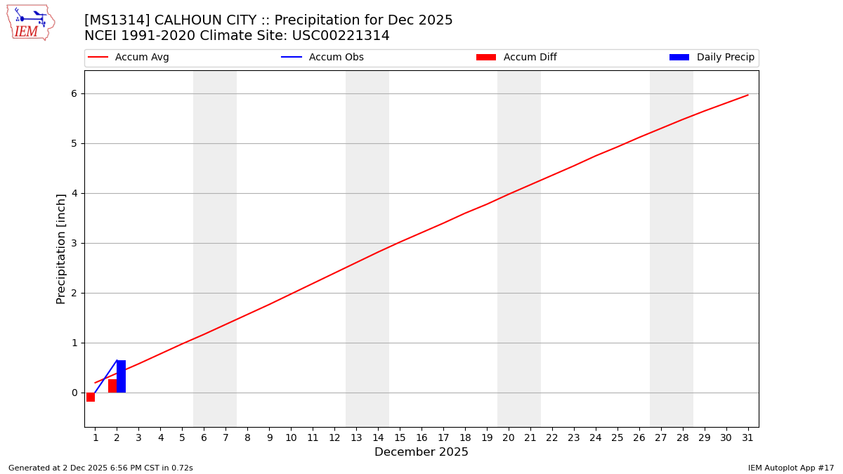 Description: This chart is of daily precipitation for the month. The red line would be an average month while the blue line and bars are observations.
