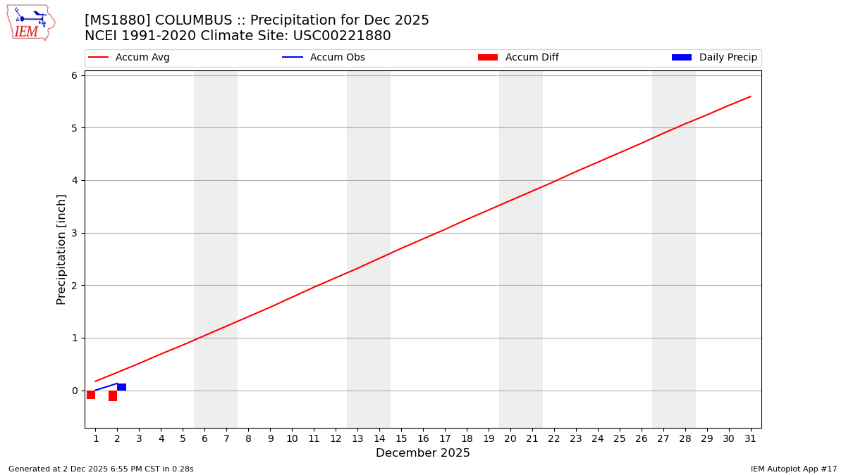 Description: This chart is of daily precipitation for the month. The red line would be an average month while the blue line and bars are observations.