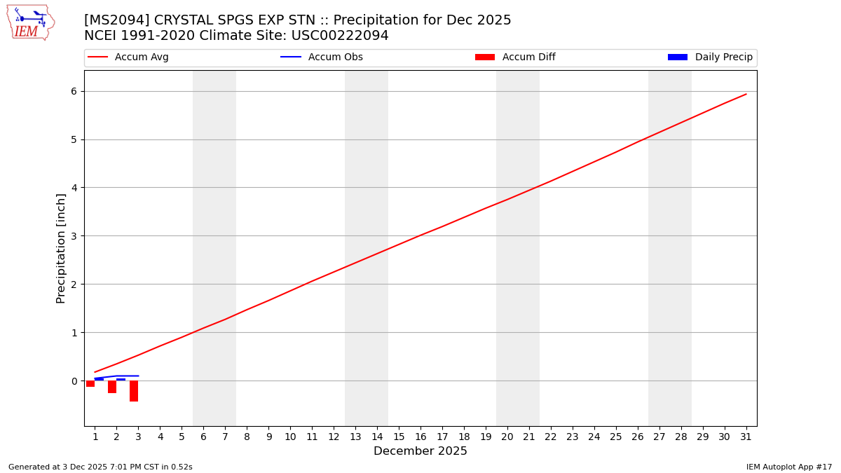 Description: This chart is of daily precipitation for the month. The red line would be an average month while the blue line and bars are observations.