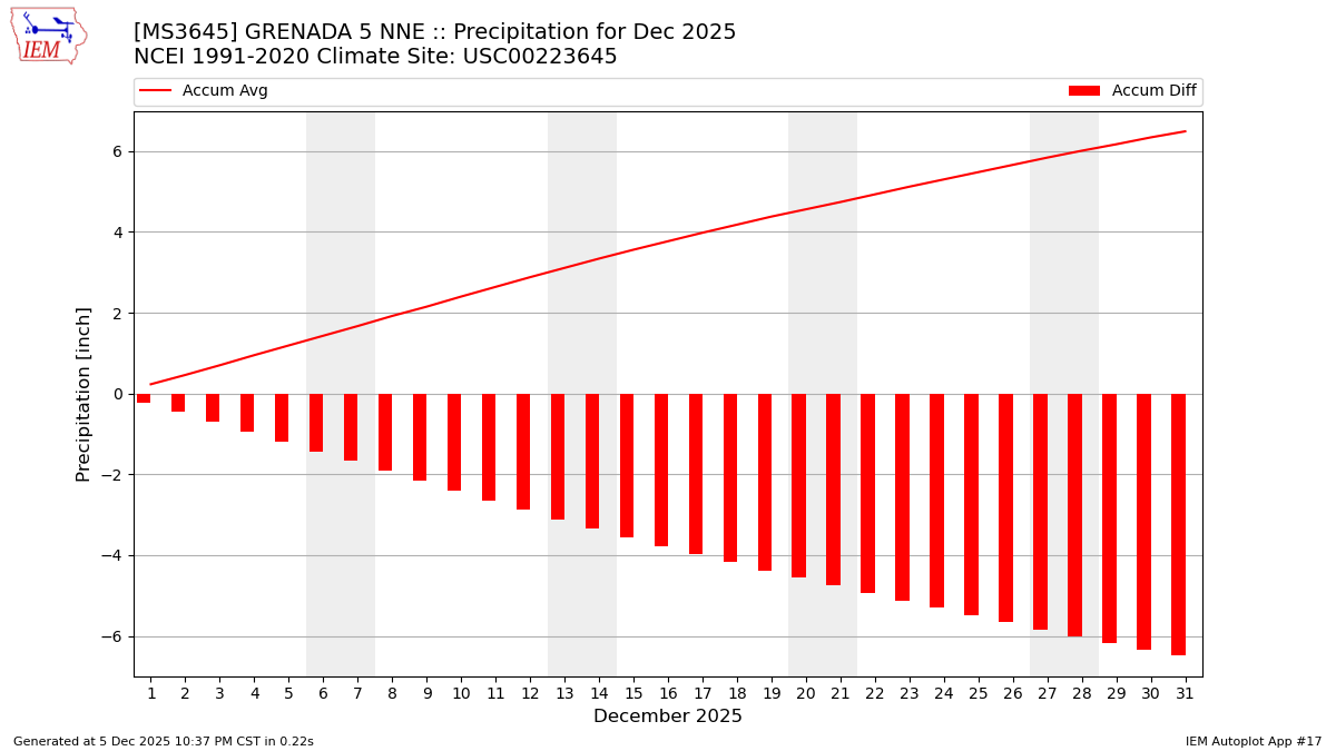 Description: This chart is of daily precipitation for the month. The red line would be an average month while the blue line and bars are observations.