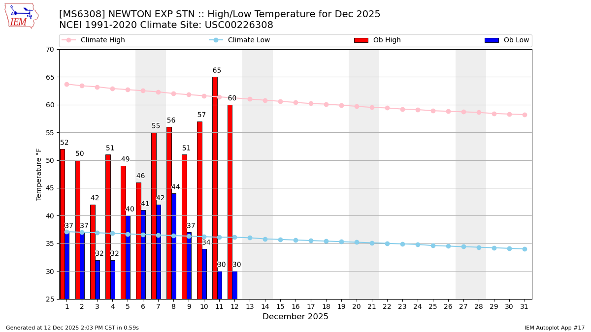 Description: This chart of the monthly temperature data. The bars are the observations and the dots are climatology.