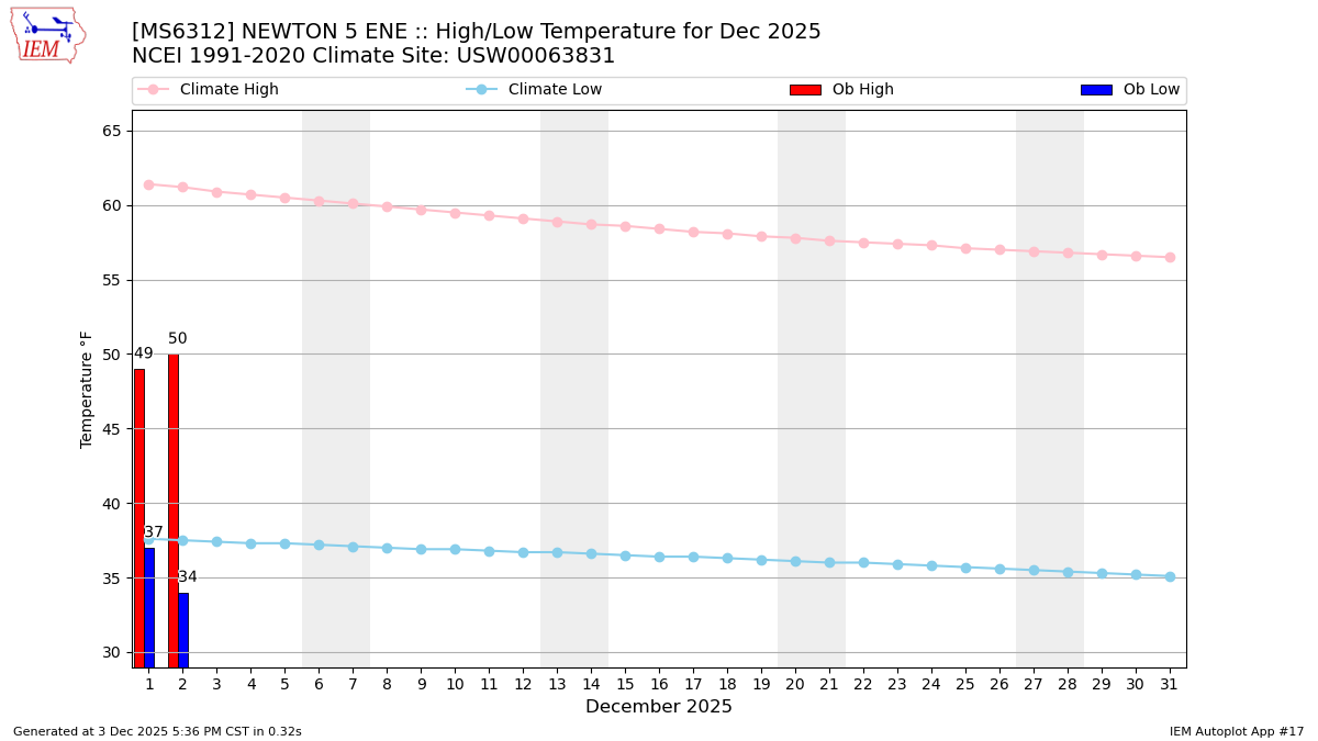 Description: This chart of the monthly temperature data. The bars are the observations and the dots are climatology.