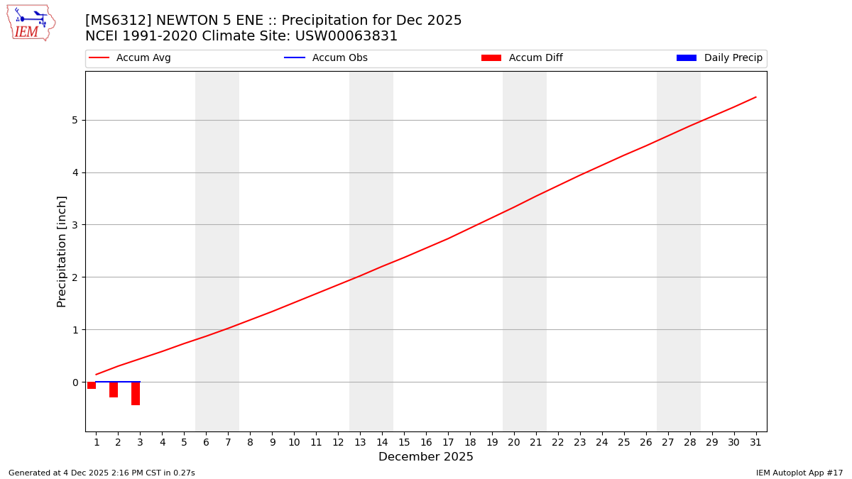 Description: This chart is of daily precipitation for the month. The red line would be an average month while the blue line and bars are observations.