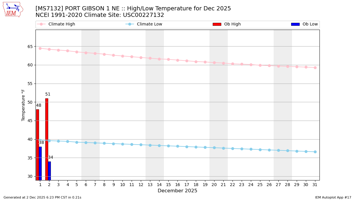 Description: This chart of the monthly temperature data. The bars are the observations and the dots are climatology.