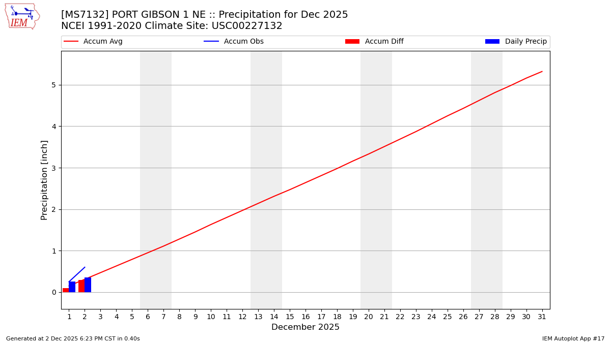 Description: This chart is of daily precipitation for the month. The red line would be an average month while the blue line and bars are observations.