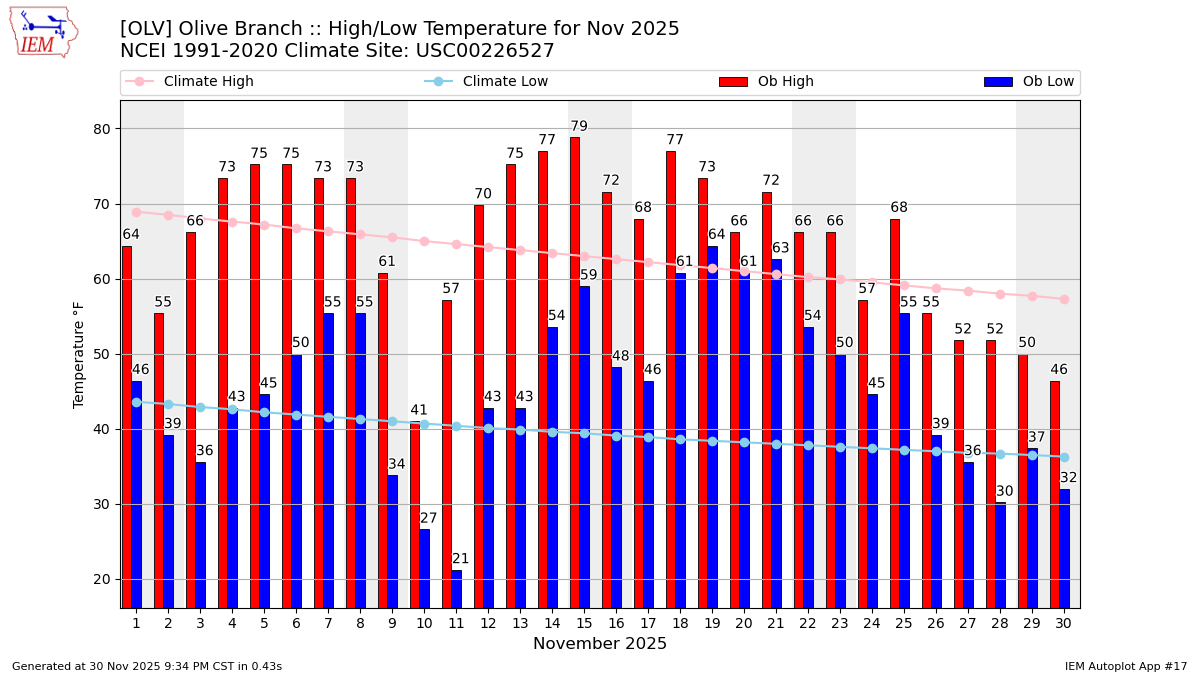 Description: This chart of the monthly temperature data. The bars are the observations and the dots are climatology.