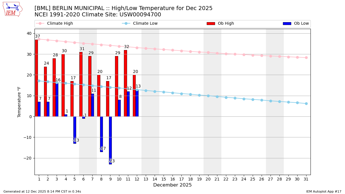 Description: This chart of the monthly temperature data. The bars are the observations and the dots are climatology.
