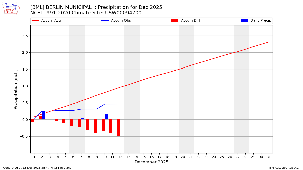 Description: This chart is of daily precipitation for the month. The red line would be an average month while the blue line and bars are observations.