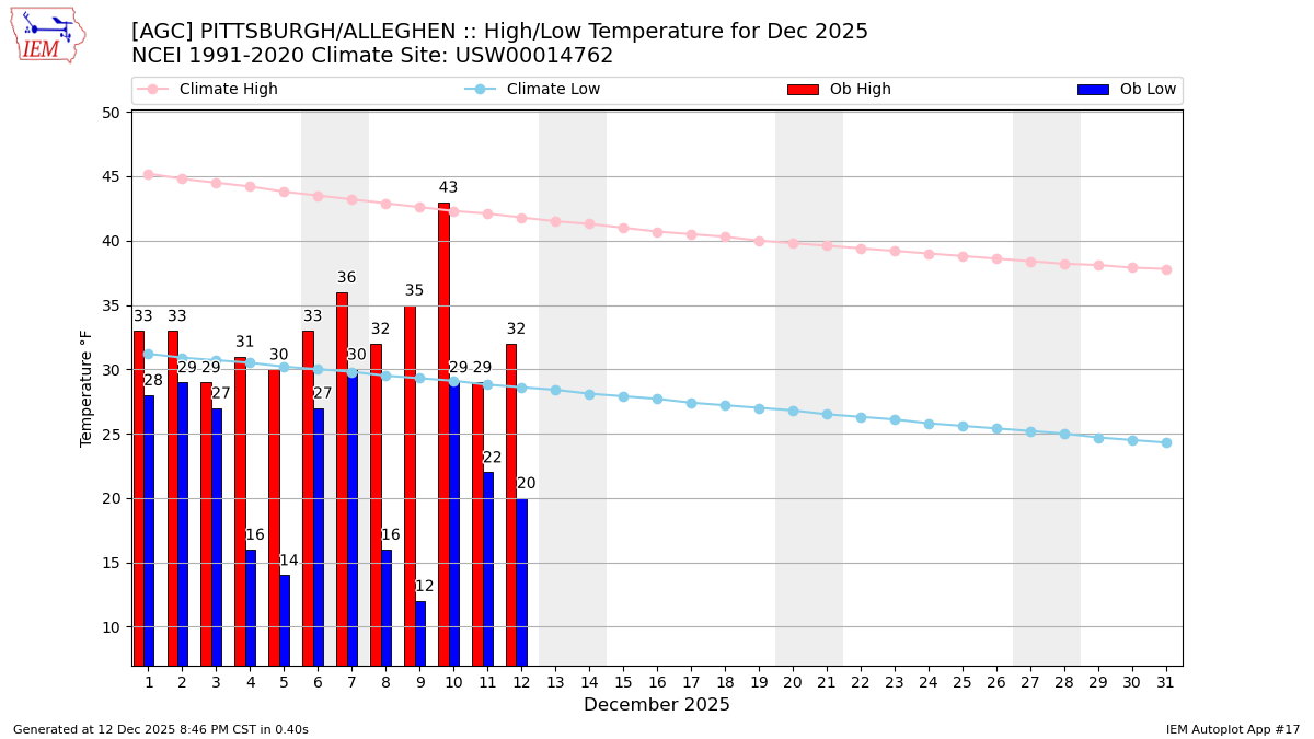 Description: This chart of the monthly temperature data. The bars are the observations and the dots are climatology.