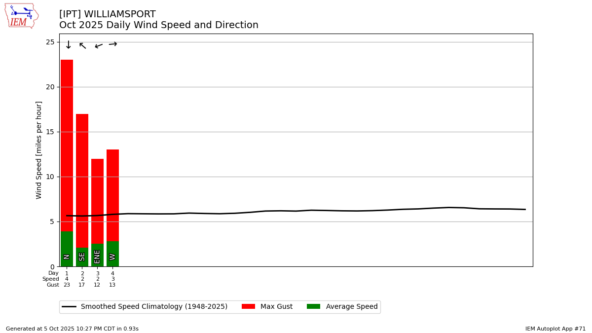 28 | 29 | 30 | 01 High: 74 Low: 47 Precip: 0.00 Snow: 0 Snow Depth: 0 Avg Wind: N @ 3.9 Gust: NE @ 23 (1:07 PM) RH% Min/Max: 22-89 Feel Min/Max: 48 to 73 | 02 High: 71 Low: 42 Precip: 0.00 Snow: 0 Snow Depth: 0 Avg Wind: SE @ 2.1 Gust: SE @ 17 (1:00 PM) RH% Min/Max: 37-93 Feel Min/Max: 43 to 70 | 03 High: 74 Low: 45 Precip: 0.00 Snow: 0 Snow Depth: 0 Avg Wind: ENE @ 2.5 Gust: NE @ 12 (7:33 PM) RH% Min/Max: 46-93 Feel Min/Max: 45 to 74 | 04 High: 83 Low: 49 Precip: 0.00 Snow: 0 Snow Depth: 0 Avg Wind: W @ 2.8 Gust: W @ 13 (2:47 PM) RH% Min/Max: 27-100 Feel Min/Max: 48 to 81 |