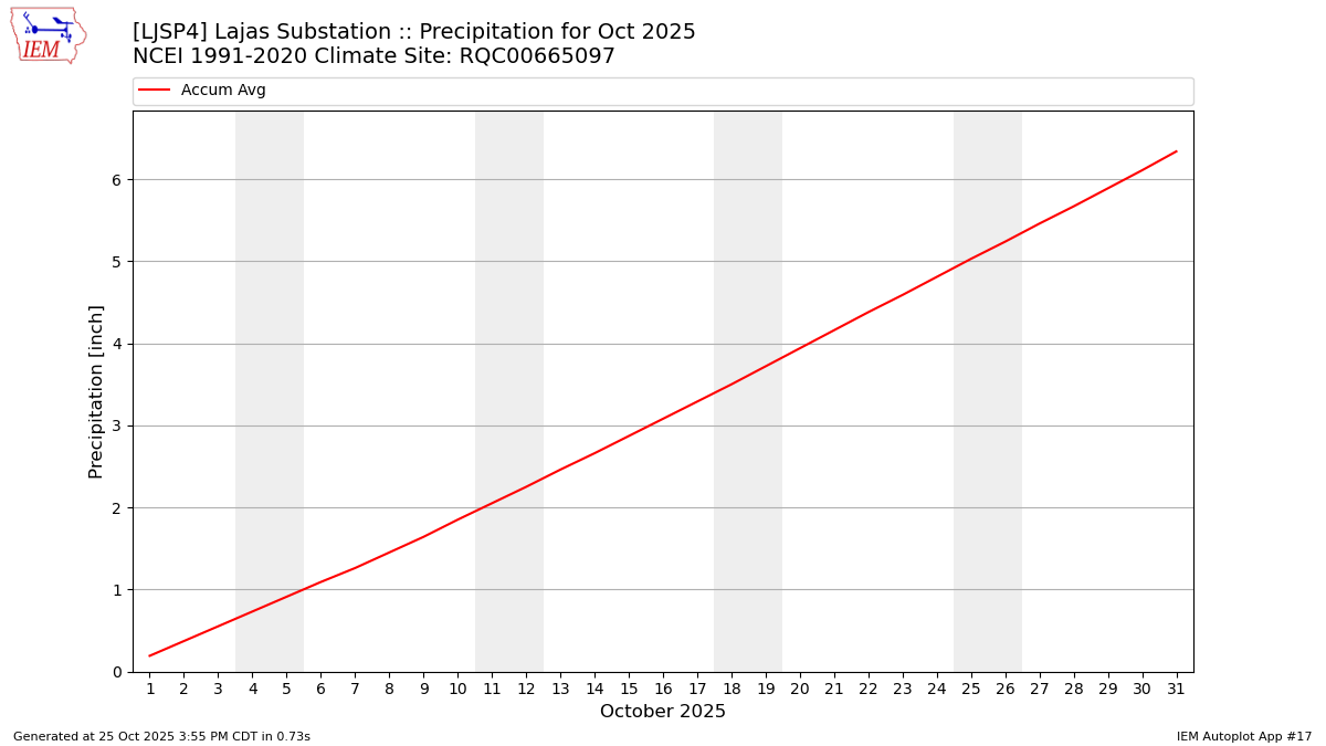 Description: This chart is of daily precipitation for the month. The red line would be an average month while the blue line and bars are observations.