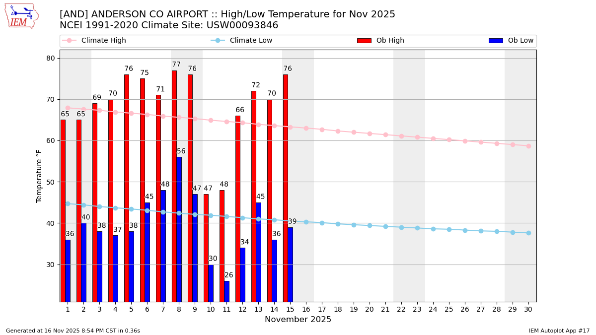 Description: This chart of the monthly temperature data. The bars are the observations and the dots are climatology.