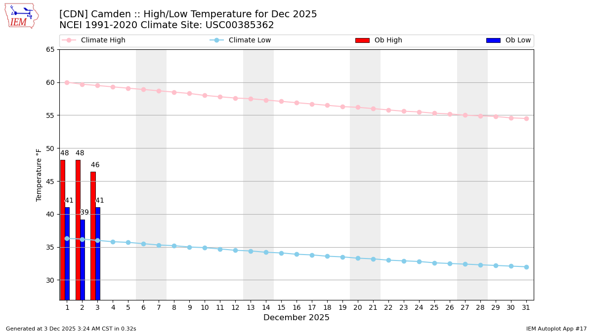 Description: This chart of the monthly temperature data. The bars are the observations and the dots are climatology.