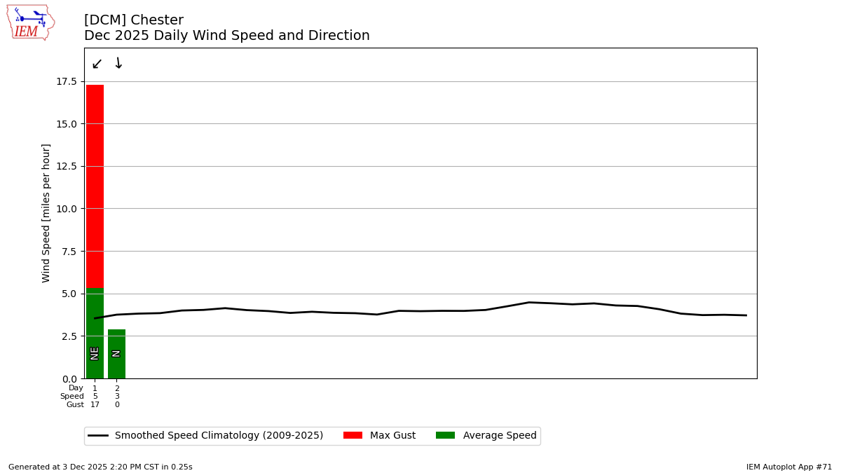 | 30 | 01 High: 44.6 Low: 35.6 Precip: M Avg Wind: NE @ 5.3 Gust: NNE @ 17 (9:55 AM) RH% Min/Max: 53-100 Feel Min/Max: 28 to 43 | 02 High: 44.6 Low: 35.6 Precip: 0.63 Avg Wind: N @ 2.9 RH% Min/Max: 93-100 Feel Min/Max: 29 to 45 | 03 High: 42.8 Low: 33.8 Precip: M RH% Min/Max: 65-100 Feel Min/Max: 29 to 43 | 04 Precip: M | 05 | 06 |