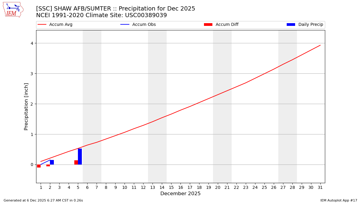 Description: This chart is of daily precipitation for the month. The red line would be an average month while the blue line and bars are observations.