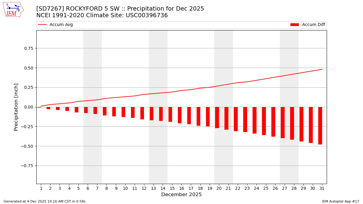 Description: This chart is of daily precipitation for the month. The red line would be an average month while the blue line and bars are observations.