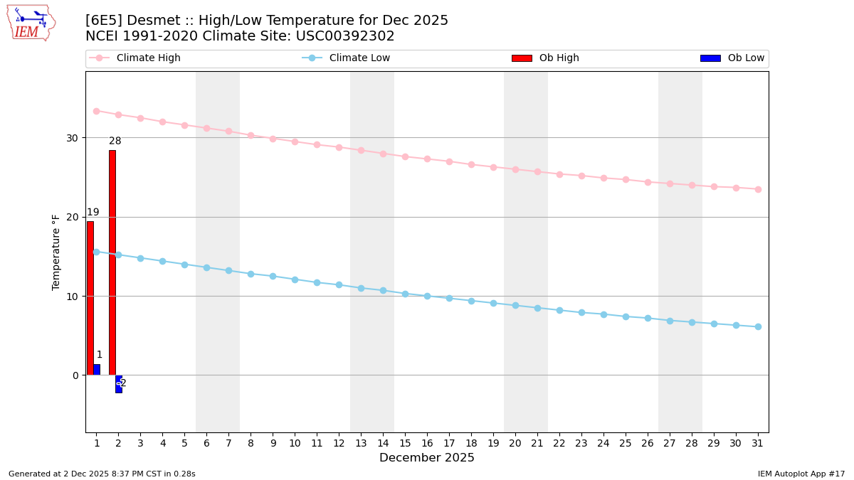 Description: This chart of the monthly temperature data. The bars are the observations and the dots are climatology.