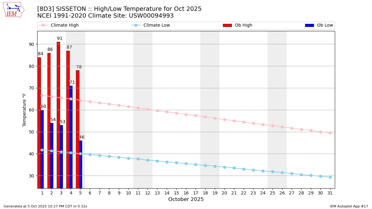 Description: This chart of the monthly temperature data. The bars are the observations and the dots are climatology.