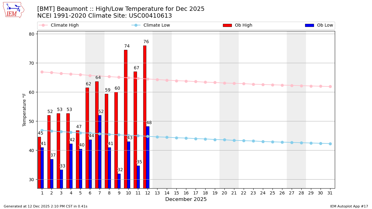 Description: This chart of the monthly temperature data. The bars are the observations and the dots are climatology.