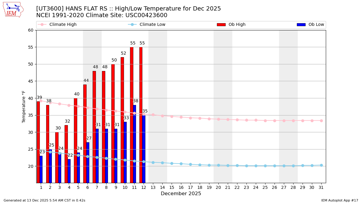 Description: This chart of the monthly temperature data. The bars are the observations and the dots are climatology.