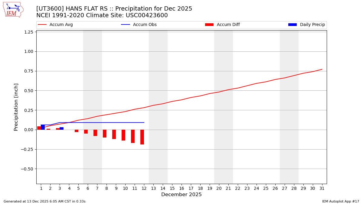 Description: This chart is of daily precipitation for the month. The red line would be an average month while the blue line and bars are observations.