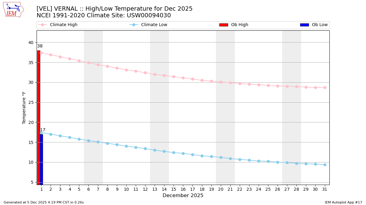 Description: This chart of the monthly temperature data. The bars are the observations and the dots are climatology.