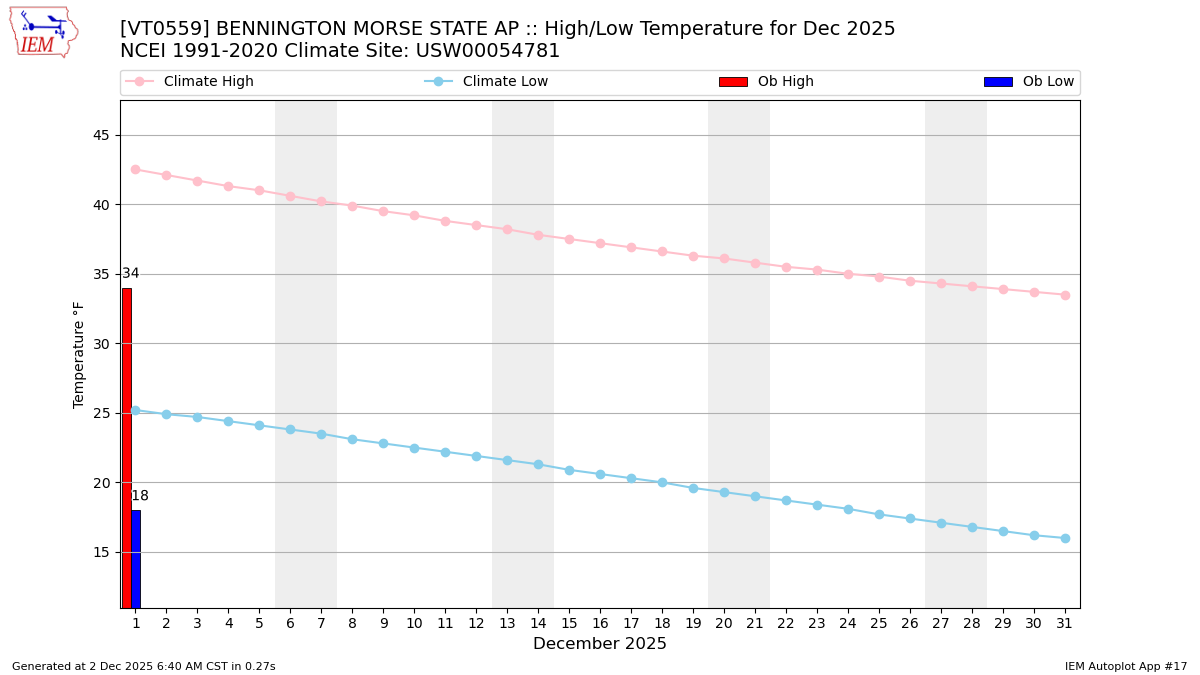 Description: This chart of the monthly temperature data. The bars are the observations and the dots are climatology.