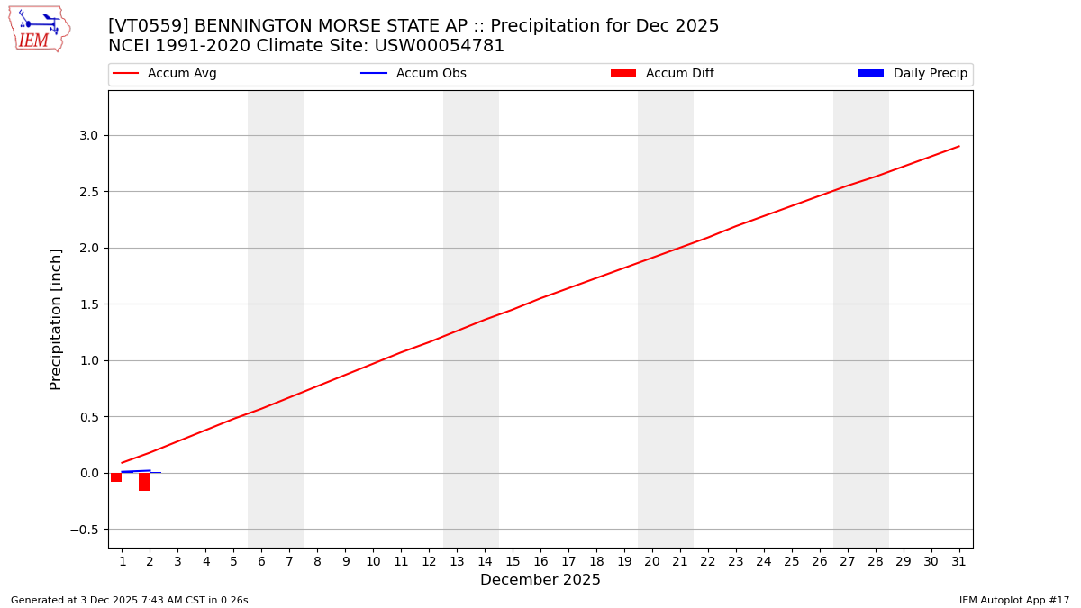Description: This chart is of daily precipitation for the month. The red line would be an average month while the blue line and bars are observations.