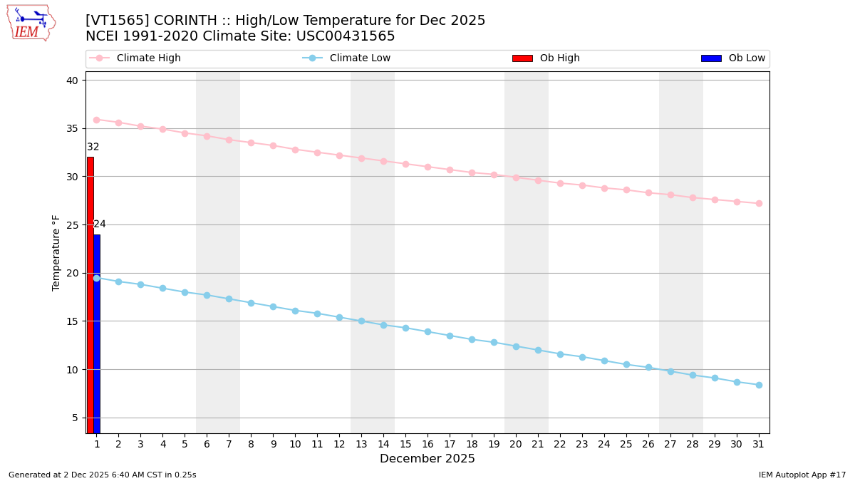 | 30 | 01 (@7) High: 32 Low: 24 Precip: 0.15 Snow: 1.4 Snow Depth: 1 | 02 | 03 | 04 | 05 | 06 |