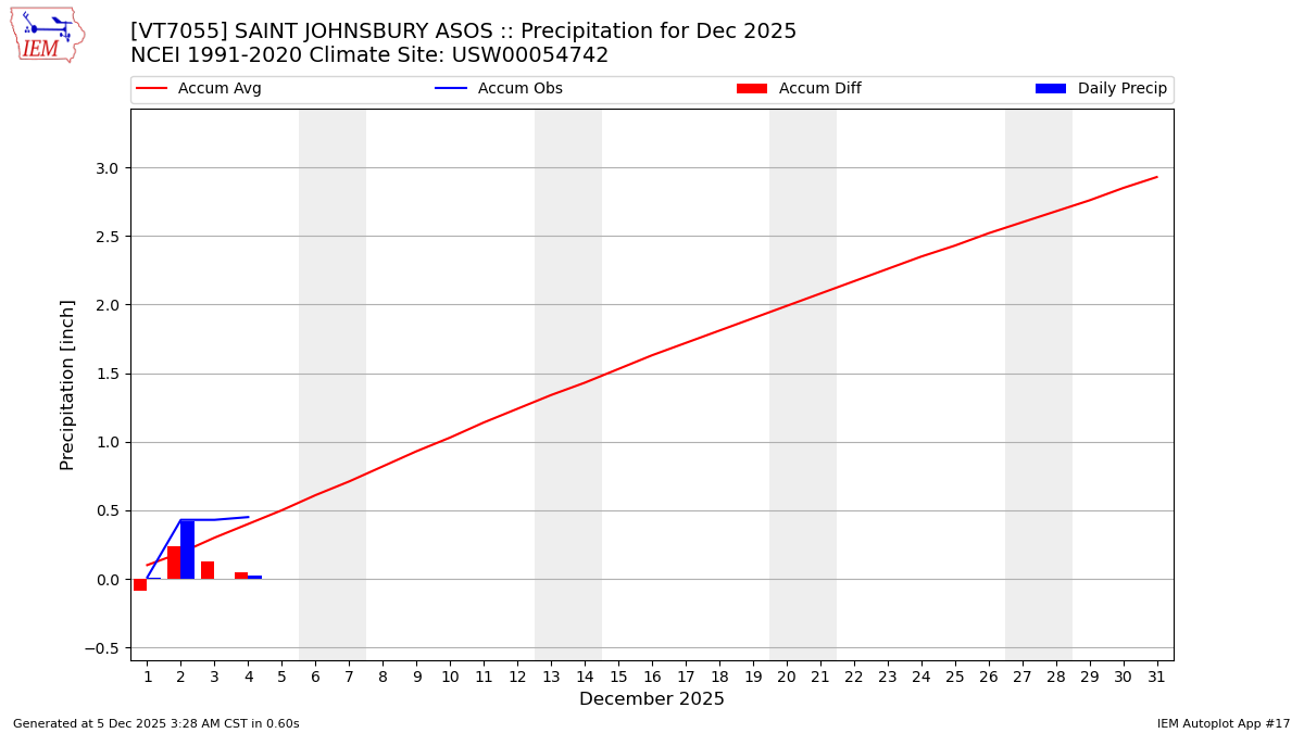 Description: This chart is of daily precipitation for the month. The red line would be an average month while the blue line and bars are observations.