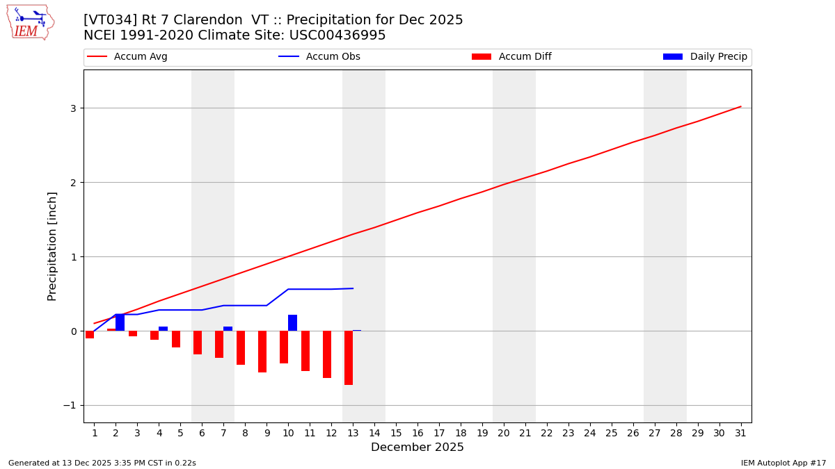 Description: This chart is of daily precipitation for the month. The red line would be an average month while the blue line and bars are observations.