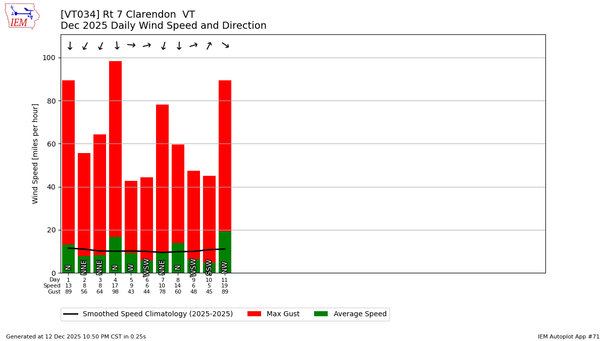 | 07 High: 34.340023 Low: 20.840021 Precip: 0.06 Avg Wind: NNE @ 9.5 Gust: 78 (10:39 PM) RH% Min/Max: 59-93 Feel Min/Max: 2 to 33 | 08 High: 21.019978 Low: -3.2799945 Precip: 0.00 Avg Wind: N @ 13.9 Gust: 60 (9:39 AM) RH% Min/Max: 43-85 Feel Min/Max: -25 to 18 | 09 High: 22.999989 Low: -7.7799945 Precip: 0.00 Avg Wind: WSW @ 6.3 Gust: 47 (10:24 AM) RH% Min/Max: 41-82 Feel Min/Max: -25 to 23 | 10 High: 35.41998 Low: 21.56001 Precip: 0.22 Avg Wind: SSW @ 4.8 Gust: 45 (11:50 PM) RH% Min/Max: 71-98 Feel Min/Max: 13 to 33 | 11 High: 37.21998 Low: 17.419977 Precip: 0.00 Avg Wind: NW @ 19.2 Gust: 89 (7:24 AM) RH% Min/Max: 36-88 Feel Min/Max: -2 to 35 | 12 High: 21.740023 Low: 12.919978 Precip: 0.00 Gust: 109 (3:24 AM) RH% Min/Max: 52-67 Feel Min/Max: -8 to 22 | 13 Precip: M |