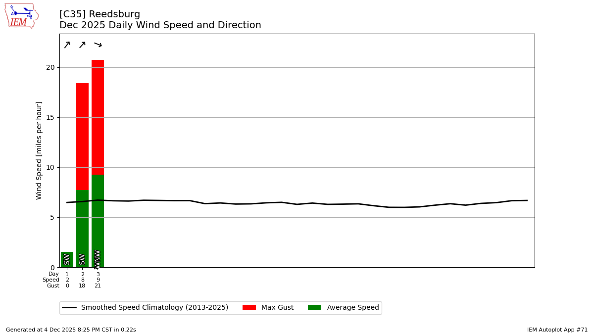 Description: This chart is of daily precipitation for the month. The red line would be an average month while the blue line and bars are observations.