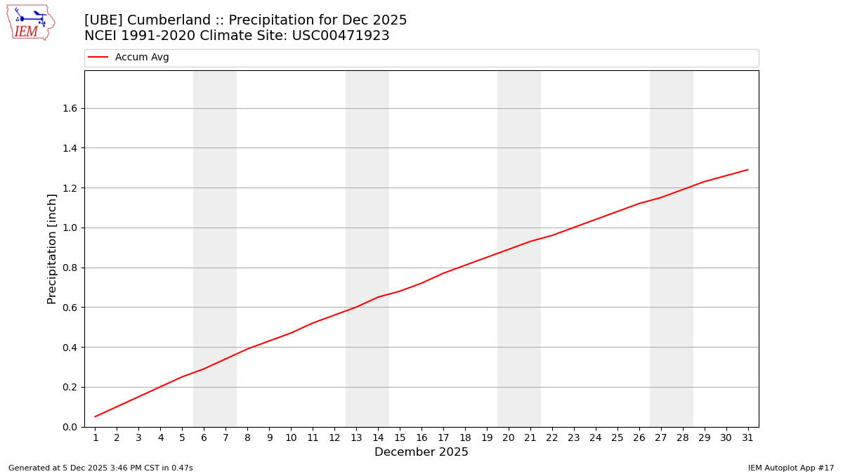 Description: This chart is of daily precipitation for the month. The red line would be an average month while the blue line and bars are observations.